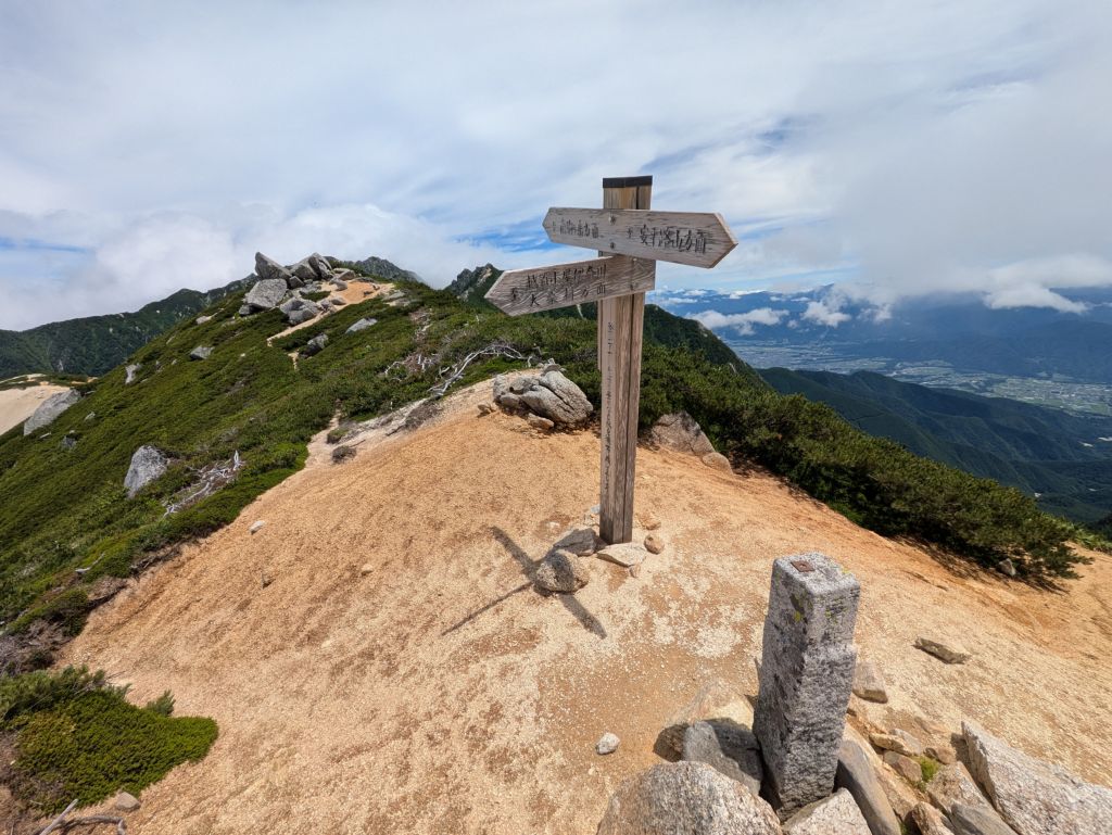 大桑野歩路会が最も愛する越百山、百の山々を越えてたどり着ける山ということからその名が付けられたと聞きます。現在は野歩路会が開拓した越百山新道により大桑村伊奈川登山口から直登ができます。飯島町からのルートは現在通行止めになっているため、大桑村から入る越百山新道が唯一の直登ルートです。
