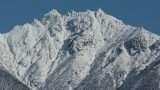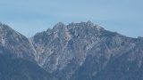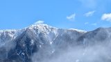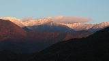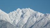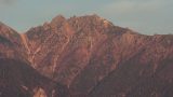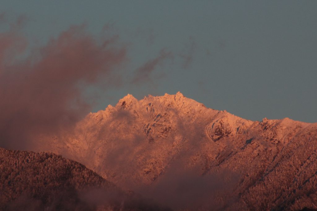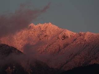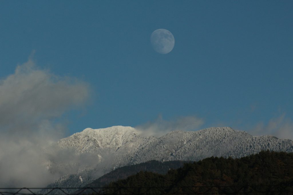 11月3日、雪を被った越百山に月が出てきました。その後仙涯嶺も夕焼けに染まりました。