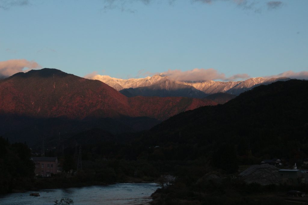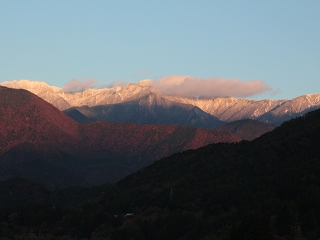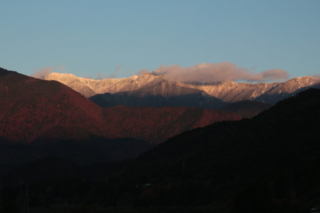 11月10日、麓の紅葉が夕陽で赤く染まるなかで、白くなった中央アルプスが輝いていました。